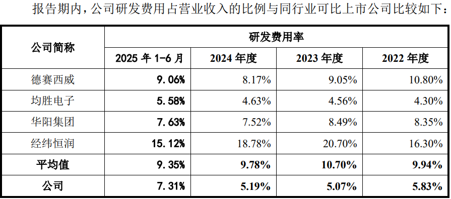 报告期内,发行人研发费用金额分别为12,686.26万元、15,237.73万元、18,001.55万元和11,118.17万元,占营业收入的比例分别为5.83%、5.07%、5.19%和7.31%,占比显著低于同行均值,占比虽高于均胜电子,但投入的金额远低于均胜电子。