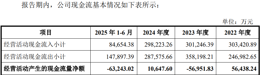 不过,发行人资金压力较大,报告期内2023年和2025年上半年均净流出,经营活动产生的现金流净额分别为-56,951.83万元、-63,243.02万元。