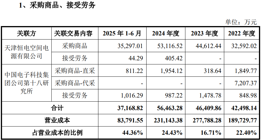 同期,发行人向天津恒电采购的金额分别为37,642.59万元、44,612.44 万元、53,521.94万元和35,297.01万元,占关联采购总额比例分别为74.77%、88.34%、84.19%和88.40%,采购主要内容为空间单体太阳电池。