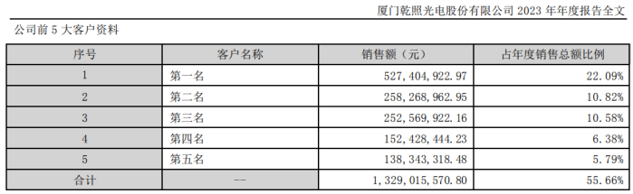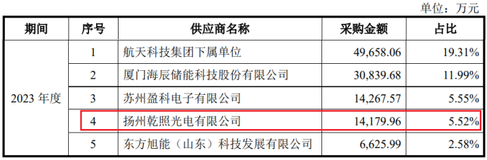 招股书显示,乾照光电全资子公司扬州乾照光电为发行人2023年第四供应商,对其采购金额为14,179.96万元,但乾照光电的前五客户销售中并无这数据,其第四、第五客户销售额分别为15,242.84万元、13,834.33万元。