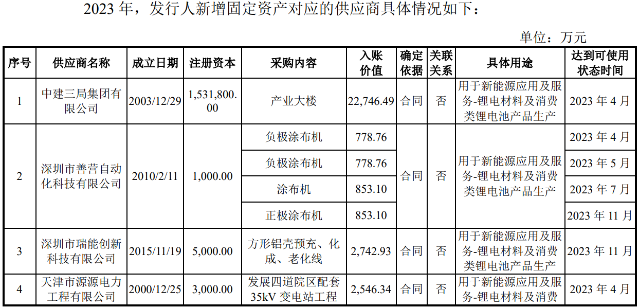 问询函显示,2022年-2023年,发行人新增固定资产金额分别为6,182.39万元、52,960.82万元、6,117.22万元,2023年新增较多,2023年,中建三局集团有限公司为新增固定资产对应的最大供应商,其为公司产业大楼的重要工程商。