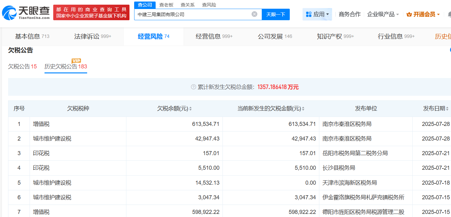 天眼查显示,中建三局涉及诉讼纠纷上万起,其中75%以上案件作为被告涉案总额39.98亿元,作为被执行人近200次,被执行总额约6.09亿元,同时,其拖欠税款1,357.19万元。
