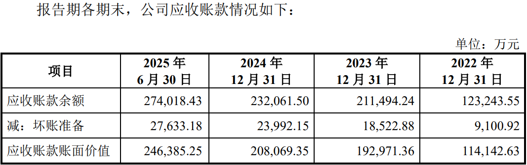 报告期各期末,公司应收账款余额分别为123,243.55万元、211,494.24万元、232,061.50万元和274,018.43万元,占各期营业收入的比例分别为48.88%、60.01%、74.21%和246.11%。
