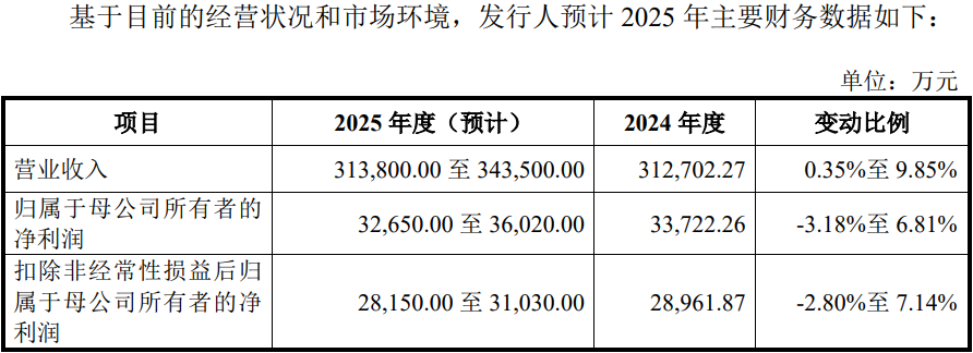 根据目前的经营状况和市场环境,发行人预计2025年收入在313,800.00万元至343,500.00万元区间,变动幅度在0.35%至9.85%之间,归属于母公司所有者的净利润变动区间在-3.18%至 6.81%。