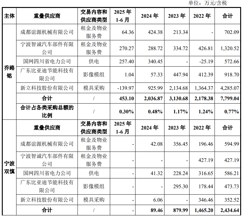 此外,双方还共同成都谊源、宁波智诚等5家供应商,报告期内,累计对重叠供应商采购的金额为15,598.07万元。