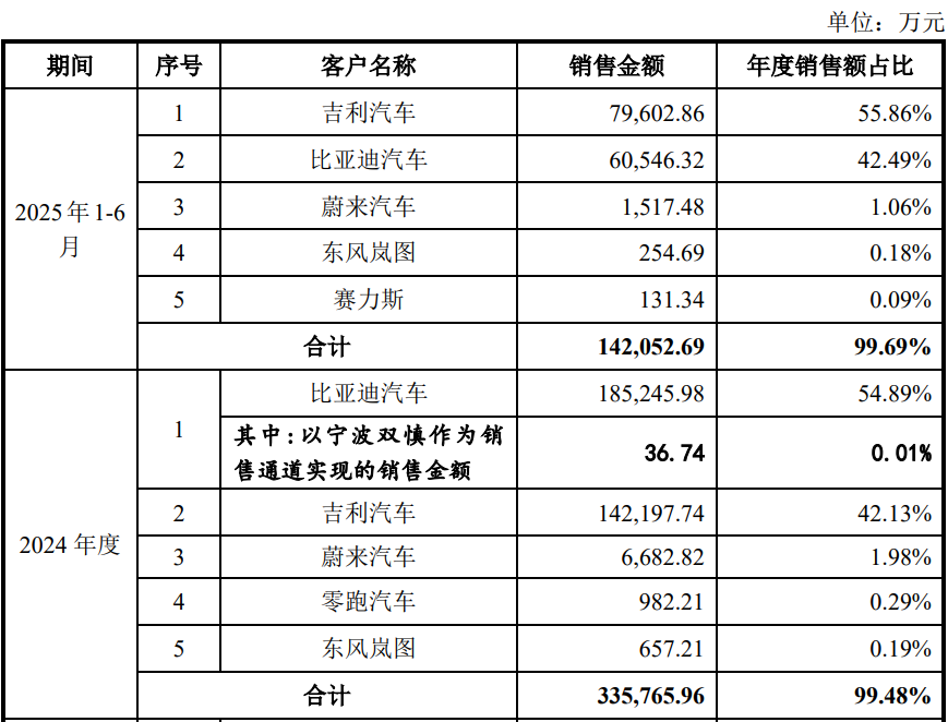 前五客户中,发行人收入主要依赖比亚迪和吉利汽车。报告期内,对比亚迪的销售收入约分别为5.68亿元、12.19亿元、18.52亿元和7.96亿元,占比分别为36.42%、47.69%、54.89%和42.49%,逐年攀升;对吉利汽车的销售金额约分别为7.98亿元、11.85亿元、14.22亿元和7.96亿元,占比分别为51.10%、46.35%、42.13%和55.86%,销售占比两期超过50%。