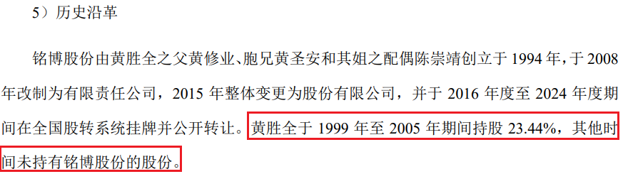 信息披露方面,乔路铭招股书显示,铭博股份于2016年度至2024年度期间在全国股转系统挂牌并公开转让。黄胜全于1999年至2005年期间持股23.44%,其他时间未持有铭博股份的股份。