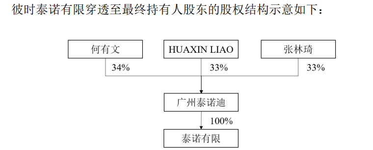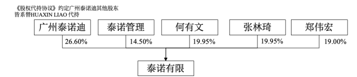 2017年3月,HUAXIN LIAO分别与何有文、张林琦签署了《股权代持协议》,约定HUAXIN LIAO 委托何有文代为持有广州泰诺迪34%股权,委托张林琦代为持有广州泰诺迪33%股权。