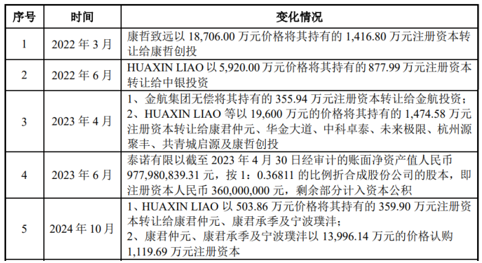 2022年4月,HUAXIN LIAO以5,920万元价格向中银投资转让877.99万元的注册资本。