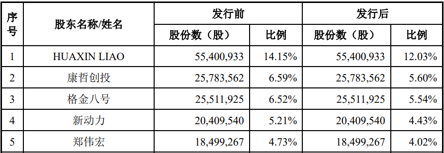 截至发行前,公司股东达49名,除HUAXIN LIAO、郑伟宏为自然人股东外,其他全部为机构投资者,公司格金八号、新动力等24名股东等属于私募,发行前,前五名股东无一持股比例超过15%。
