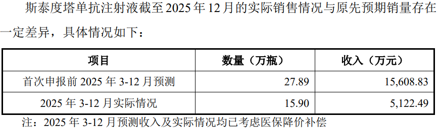 对于公司2025年度实际收入与首次申报时原预测收入规模存在差异,招股书称主要原因包括:①斯泰度塔单抗注射液纳入医保目录后的终端价格下降幅度高于原预期,因此需计提更大金额的降价补偿以冲减2025年度收入;②2025年斯泰度塔单抗注射液实际销量不及原预期。