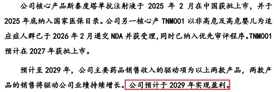 而上述盈利时间点在此次上会稿中被延迟了两年,预计2029年实现盈利,除了核心产品斯泰度塔单抗注射液销售产生的收入和利润外,还需要TNM001产品的销售收入,该产品以非高危及高危婴儿为适应症人群已于2026年2月递交NDA 并获受理,预计2027年获批上市。