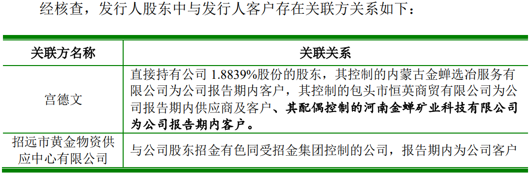 大客户中,内蒙古金蝉为股东宫德文控制的企业,发行人向其销售销售环保型贵金属选矿剂,各期销售金额分别为707.82万元、2,290.65万元和2,509.06万元。
