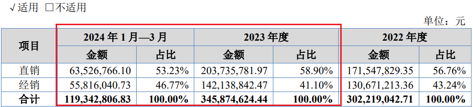 2023年相差约1.3亿元,2024年公开转让说明书一季度经销收入超过了北交所上会稿全年的经销收入。
