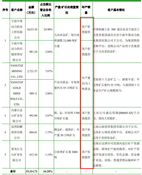 而当保荐机构核查相关客户有关年产情况是否与销售相匹配时,宁波中策、金山矿业、昆明阳麒商贸和山东中农嘉吉环保等客户拒绝提供。