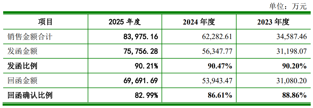 报告期内,公司对主要客户发函金额分别为31,198.07万元、56,347.77万元和75,756.28万元,未回函金额分别为117.88万元、2,404.30万元和6,064.59万元,累计金额为8,586.77万元。