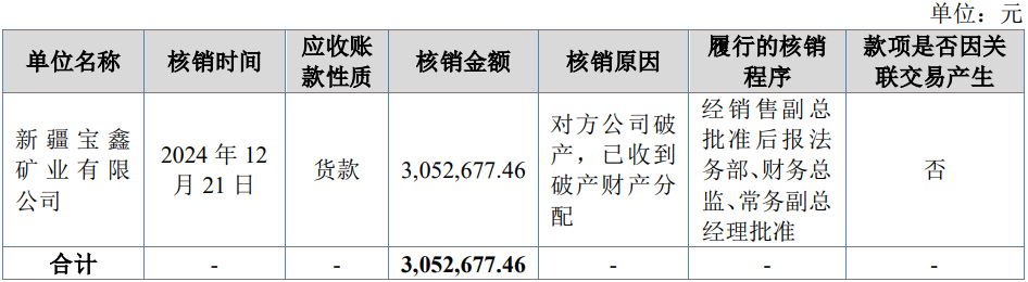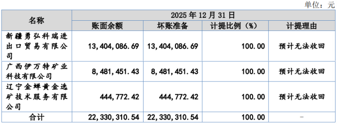 同时,发行人还踩雷了宝鑫矿业、勇弘科瑞进出口贸易、广西伊万特矿业科技、辽宁金蝉黄金选矿、马贵(自然人客户)、安徽矿业等。2025年,前三家企业累计2,233.03万元被计提坏账准备,预计无法收回。