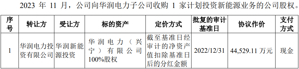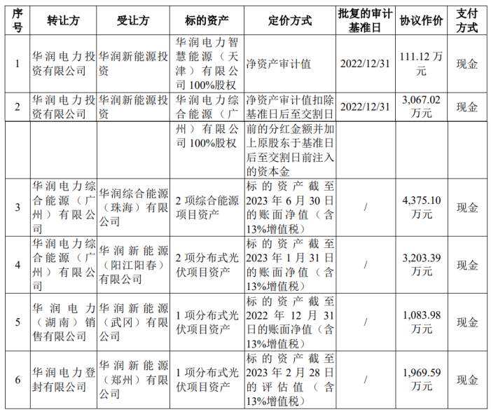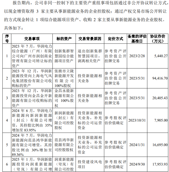 2022年9月至12月,发行人向华润电力及其子公司收购多家新能源业务相关资产,包括以股权为对价收购Elite Wing100%股权、现金收购华润智慧能源投资100%股权、以现金向南国能源等公司收购17家从事新能源发电业务的境内项目公司股权等。