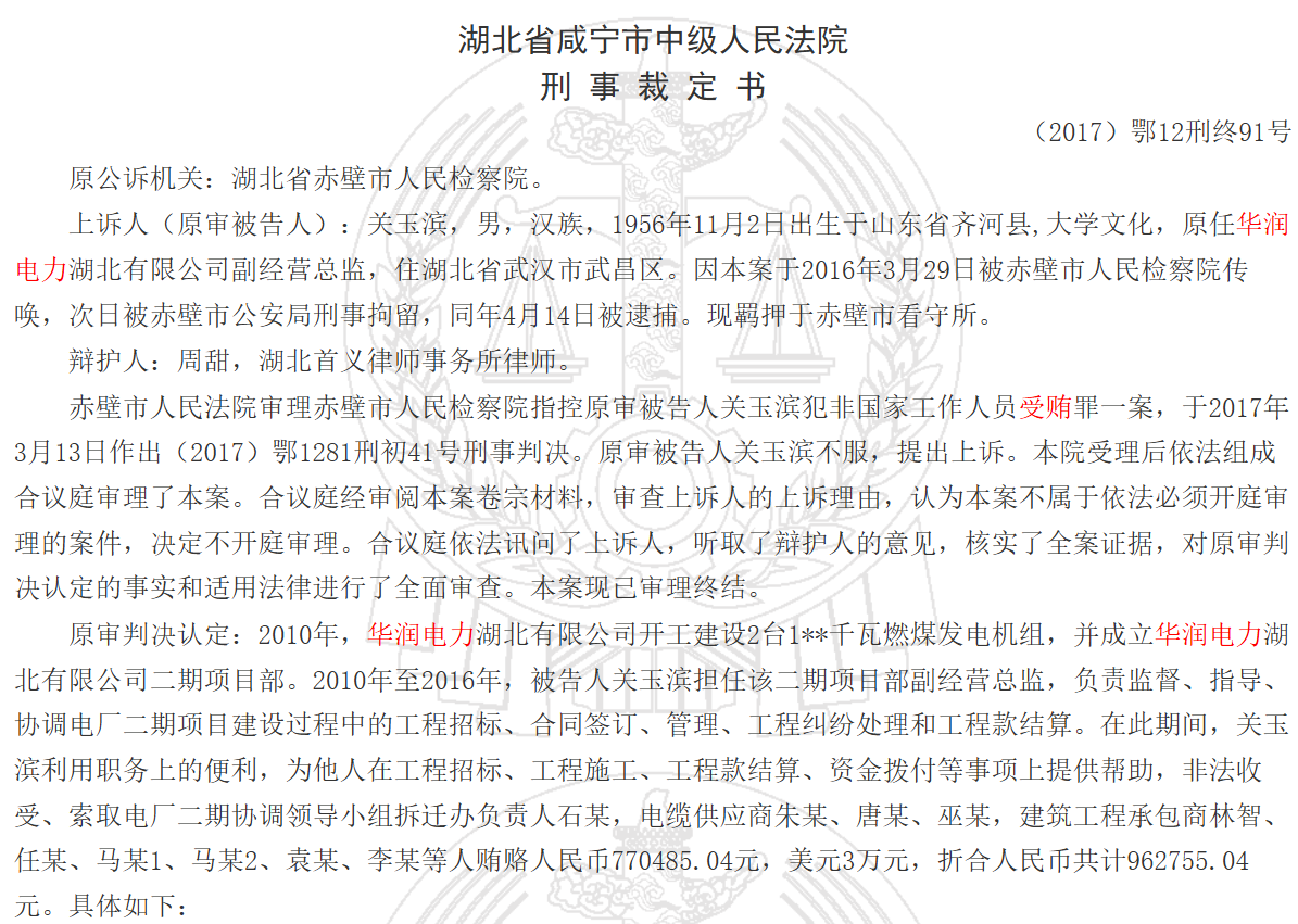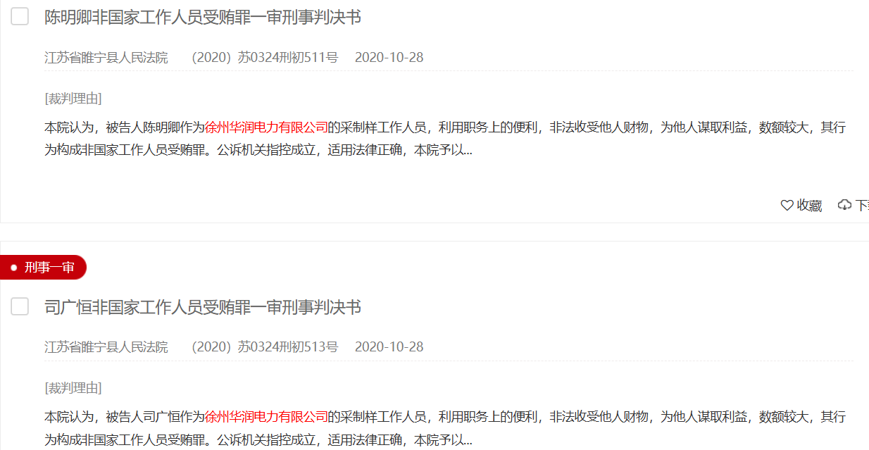 裁判文书网显示,涉及华润电力的受贿案件文书达70多篇,华润电力受贿案件中还包括曾出现了一起窝案,2020年10月,江苏徐州市睢宁县法院对一起销售伪劣产品和对非国家工作人员行贿案作出终审判决,涉及徐州华润电力有限公司采制样、调度、程控等多个岗位30余人的受贿窝案。