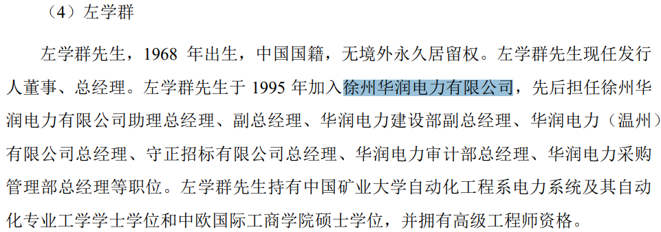 招股书显示,发行人董事、总经理就曾履职于徐州华润电力有限公司,先后担任过助理总经理和副总经理。