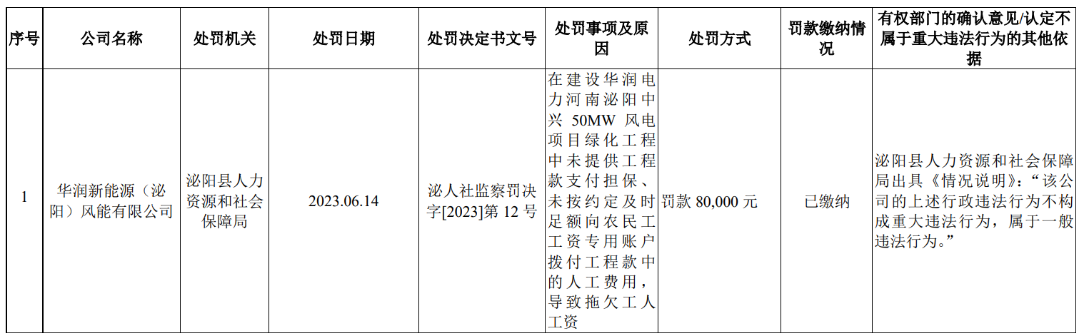 公开资料显示,2019年11月12日16时许,发行人子公司华润风电(海原)有限公司海原呱呱山200MW风电项目在建工地发生一起较大事故,造成5人死亡。事故发生后,事故责任单位未向当地政府及有关部门报告情况,刻意隐瞒事故真相,后经群众举报、有关部门多次核查,查实了其瞒报事故的行为。