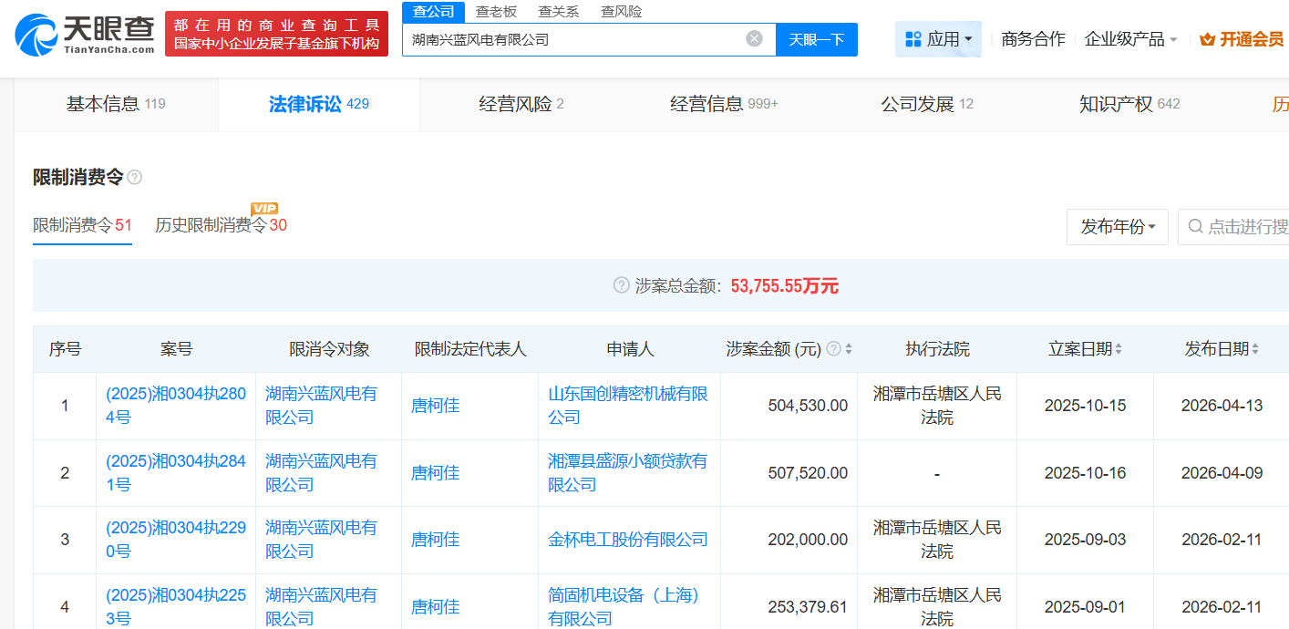 天眼查显示,湖南兴蓝风电存在较大风险,列入被执行人200多次涉案总额15.6亿元,被限消共81次涉案总额约9.58亿元,失信3次涉案金额0.25亿元。