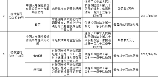 广西保监局近日公布关于中国人寿(22.830, -0.52, -2.23%)保险股份有限公司南宁市武鸣支公司、中国人寿保险股份有限公司桂平支公司、中国人寿保险股份有限公司隆安支公司的行政处罚决定。三家公司均存在未经批准变更营业场所的行为。广西保监局分别对中国人寿保险股份有限公司南宁市武鸣支公司、中国人寿保险股份有限公司桂平支公司、中国人寿保险股份有限公司隆安支公司处以罚款5万元,并对相关责任人孙宇、黄健斌、卢兴军、周红艳分别给予警告并处以罚款5万元。