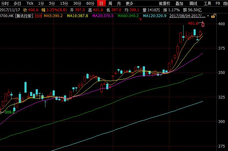 环球财经网财经讯 11月17日港股腾讯控股大涨,股价再创历史新高,盘中突破400元港元大关,截至发稿,股价报400.8港元,涨幅2.25%,总市值突破3.8万亿港元,盘中最高触及401.6港元。