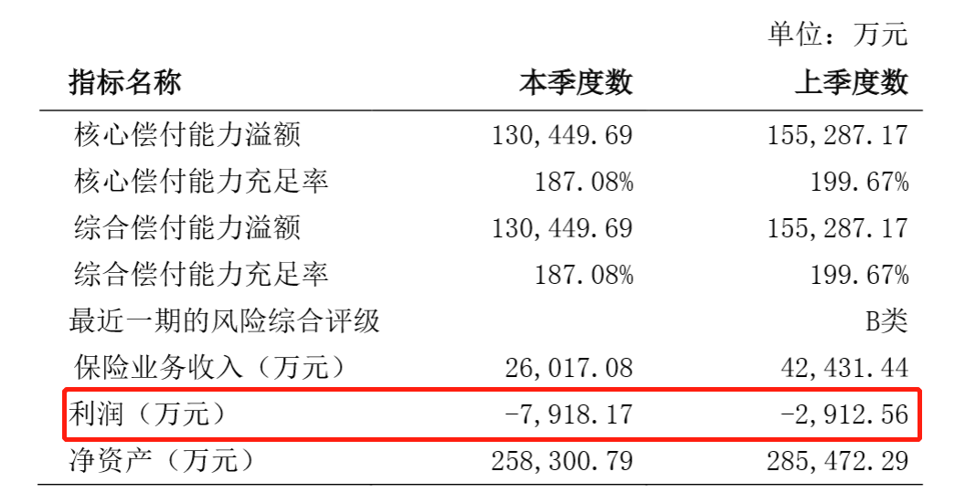 报告称,2018年第四季度,东吴人寿核心及综合偿付能力充足率均为187.08%,实现保险业务收入2.6亿元,相比2018年三季度的4.2亿元下滑逾38%;净利润亏损7918.17万元,亏损额度是2018年三季度的2.7倍,再加上二季度亏损的4775.86万元,以及一季度亏损的1780.58万元,东吴人寿2018年全年净利润共计亏损约1.74亿元。