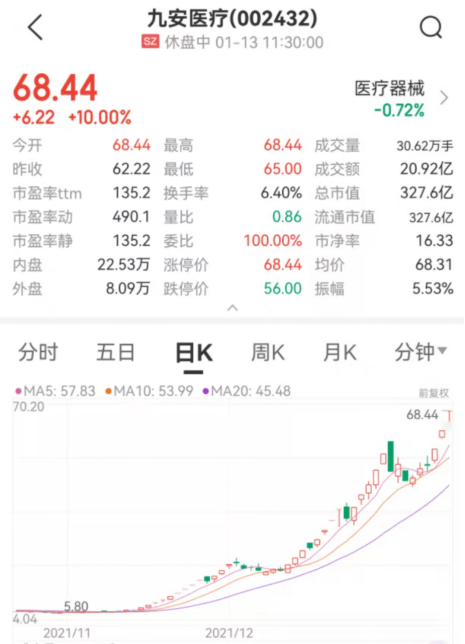 据中证金牛座APP数据,1月13日早盘,九安医疗开盘一字涨停,盘中短暂开板,但随后又封住涨停板。从11月8日至今,九安医疗累计涨幅达1040.67%。