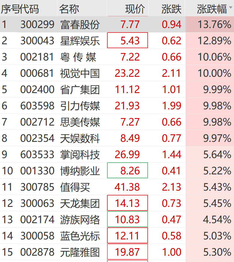 个股方面,富春股份(7.420, 0.59, 8.64%)(维权)、星辉娱乐(5.430, 0.62, 12.89%)涨超10%,粤传媒(7.220, 0.66, 10.06%)(维权)5日4板,视觉中国(23.220, 2.11, 10.00%)、省广集团(11.120, 1.01, 9.99%)、引力传媒(21.930, 1.99, 9.98%)、思美传媒(7.270, 0.66, 9.98%)(维权)等多股涨停。