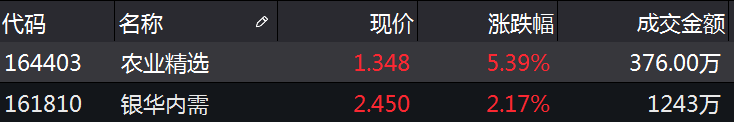 场内农业主题基金较少,不过与昨日的分化表现不同,今日农业精选(164403.SZ)、银华内需(161810.SZ)两只基金分别涨超5%及2%。