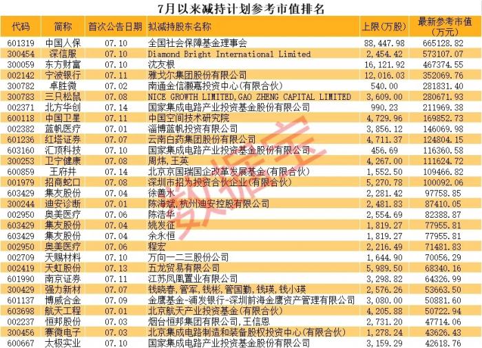 随着市场的大幅上涨,重要股东们也加快减持步伐。数据宝统计显示,按照最新收盘价以及减持计划上限计算,仅7月份以来,重要股东减持计划参考市值接近700亿元。这其中不乏部分市值较大的减持。