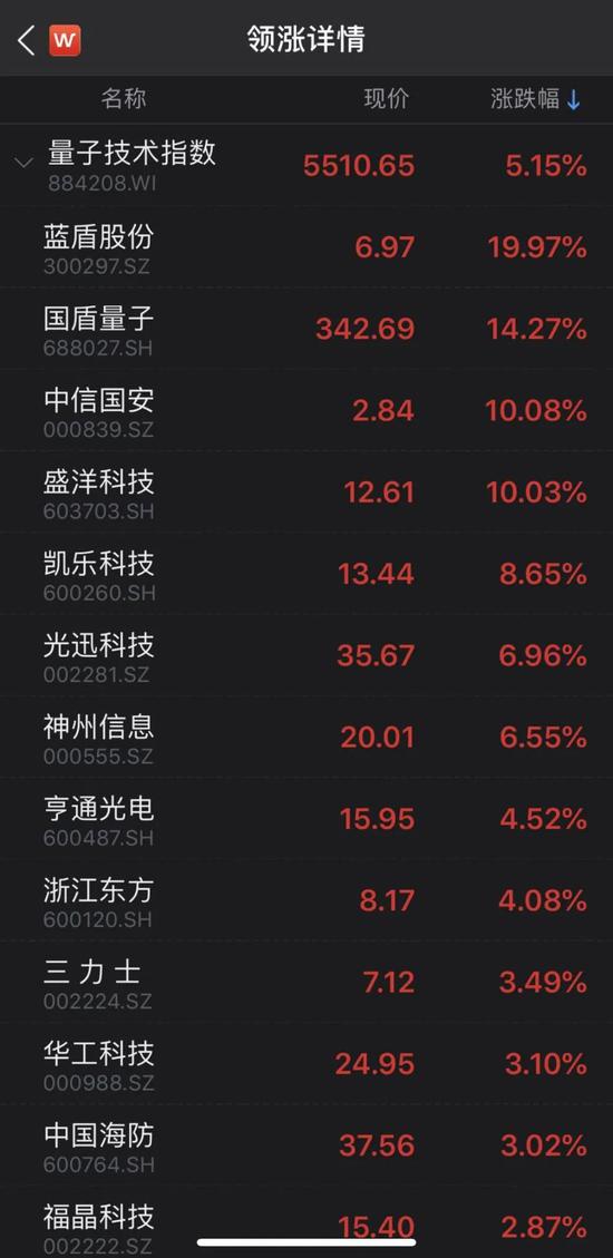 在今日的市场中,表现最为强势的当属量子技术板块,截至午间收盘,Wind量子技术指数上涨5.15%,板块内蓝盾股份(6.970, 1.16, 19.97%)、中信国安(2.840, 0.26, 10.08%)(维权)、盛洋科技(12.610, 1.15, 10.03%)涨停,国盾量子(328.880, 28.98, 9.66%)涨逾14%。