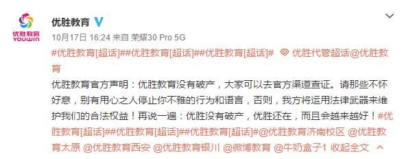 10月17日,优胜教育在官方微博发布声明,称“优胜没有破产,优胜还在,而且会越来越好”。然而,部分网友并不买账,在其评论区留言称“找不到人”“各校区悄悄关闭是什么情况”,也有自称优胜教育员工的网友留言“工资没有了,社保也没有交完”。