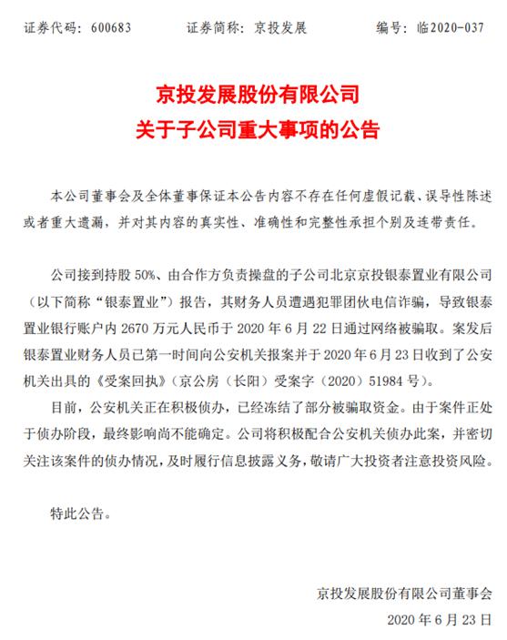 6月23日,京投发展(4.280, -0.01, -0.23%)(600683)公告称,公司接到持股50%、由合作方负责操盘的子公司北京京投银泰置业,其财务人员遭遇犯罪团伙电信诈骗,导致银泰置业银行账户内2670万元于2020年6月22日通过网络被骗取。若按照2019年实现的净利润计算,该公司此次被骗取的2670万元约为其去年净利润的6倍之多。