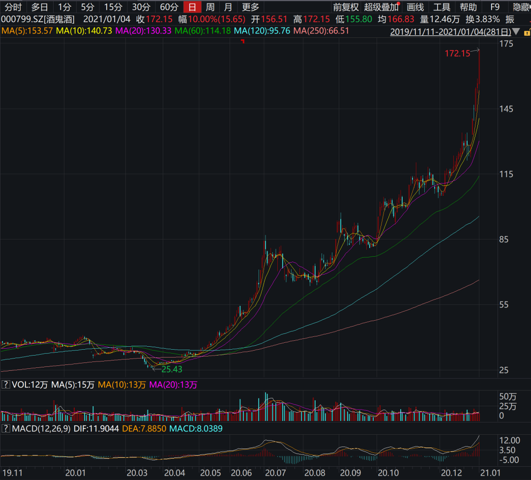 纵观2020年,酒鬼酒股价狂飙突进,全年股价涨幅达338.27%。若从2020年3月24日的盘中最低点25.43元/股计算,到今年1月4日收盘,其区间涨幅更是高达576.97%。