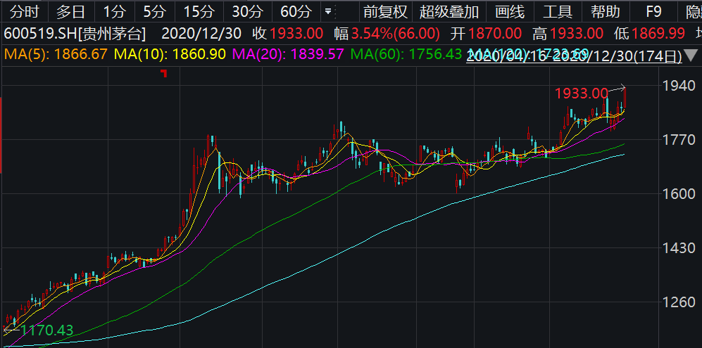 与此同时,贵州茅台股价去年上涨了71.36%。进入2021年,贵州茅台股价继续走高。1月4日,茅台股价在盘中一度冲上2000元,1月5日,一鼓作气站上2000元大关,当天大涨超3%,随后继续高举高打,短短2天后,直接逼近2100元。1月13日虽然大盘回调,但茅台盘中再创历史新高达到2173.33元,市值已超过2.7万亿元。