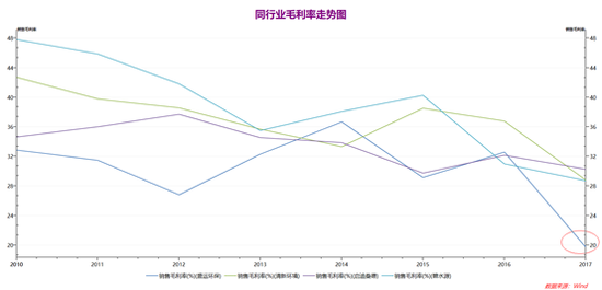 据上图,根据申万三级行业分类,选取与盛运环保同行业的启迪桑德(11.850, 0.09, 0.77%)、伟明环保(24.390, 0.76, 3.22%)和清新环境(8.790, 0.04, 0.46%)作为比较对象,不难看出,同行业毛利率基本上在30%附近徘徊,而盛运环保毛利率在2017年四季度突然下滑到19.76%,相较于三季度毛利率40.07%,环比下降50.69%,同时也远低于同行业,通常来说毛利率变化不会太大,这是否是盛运环保经营出现问题的一个信号呢?
