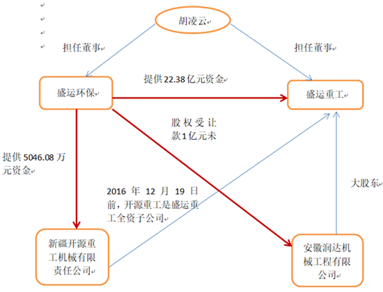截止2018年5月30日,盛运环保对安徽盛运重工机械有限责任公司提供22.38亿元资金,盛运重工董事胡凌云女士(已于2018年6月12日辞职)兼任盛运重工董事,属于关联关系;盛运环保向新疆开源重工机械有限责任公司提供资金5046.08万元,2016 年 12 月 19 日前,新疆开源重工机械有限责任公司为公司关联方安徽盛运重工机械有限公司全资子公司;因股权转让款及资金占用利息,安徽润达机械工程有限公司股权受让款1亿元一直未清偿上市公司,而安徽润达机械工程有限公司为公司关联方盛运重工大股东。关联方非经营性占用资金的行为难免会让外部猜疑。