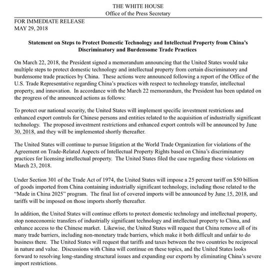 中美贸易问题仍是市场关注焦点。美国白宫周二声明称,美国将对500亿美元含有“重要工业技术”的中国进口商品加征25%的关税,包括与“中国制造2025”相关的技术,最终清单将在6月15日之前公布,关税将在此后不久施行。