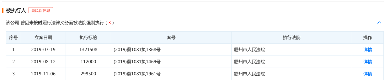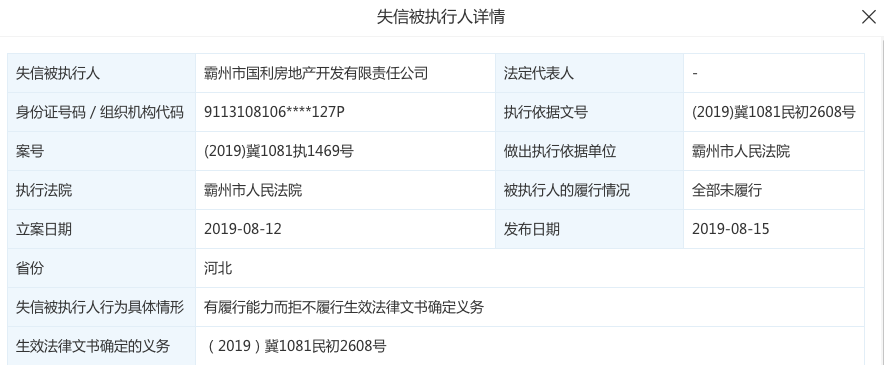 天眼查数据显示,霸州市国利房地产开发有限责任公司成立于2013年2月1日,注册资本5016万人民币。凤凰网财经梳理发现,2019年下半年,该公司三次被当地法院列为执行人;8月15日,该公司被列为失信被执行人也就是“老赖”,具体情形为“有履行能力而拒不履行生效法律文书确定义务”。