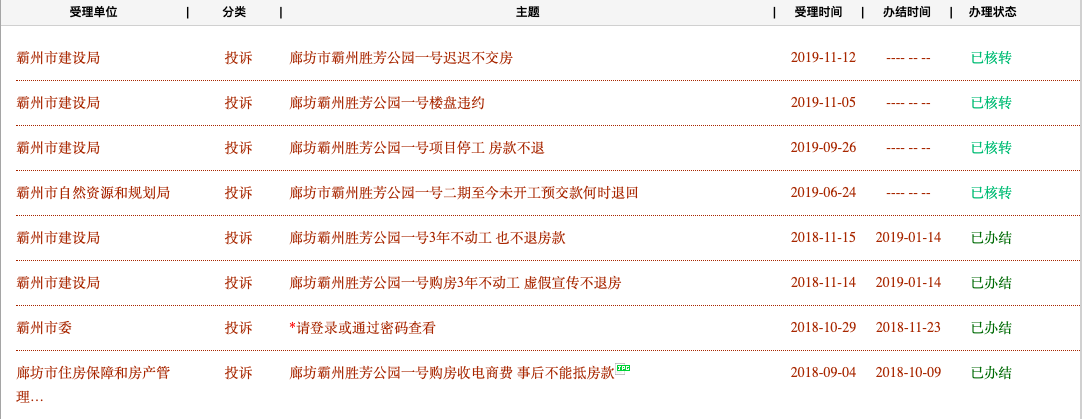 在河北新闻网“阳光理政”平台上,霸州胜芳公园1号项目可以说“劣迹斑斑”,仅去年9月到今年11月的相关投诉就有8条,几乎都是围绕该项目楼盘违约、迟迟不交房的问题。