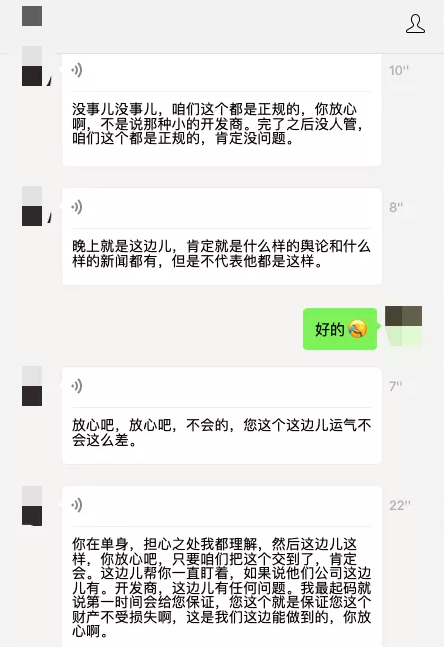 在小羽向凤凰网财经出具的和尉姓店长的微信聊天记录里,对方很笃定地说房子“都是正规的,肯定没问题”、“开发商有任何问题,我们会第一时间保证财产不受损失”…一番拍胸脯的保证之后,萦绕在小羽心头的疑虑被彻底打消。