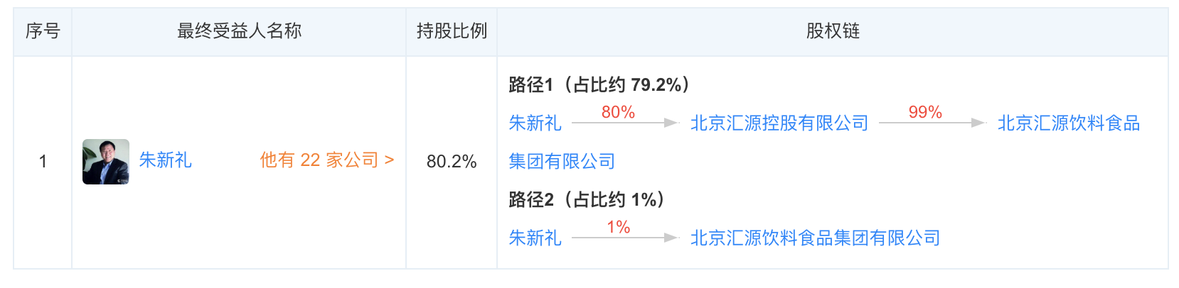 上市公司汇源果汁是从北京汇源集团分拆成立的欧公司,主营果汁及果汁饮料的现代化大型企业集团。天眼查显示,朱新礼为北京汇源集团疑似控制人,合计持股约80.02%。