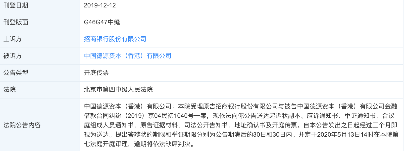 凤凰网财经发现,招行和德源资本金融借款合同纠纷已由北京市第四中级人民法院受理,该案将于2020年5月13日开庭。