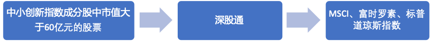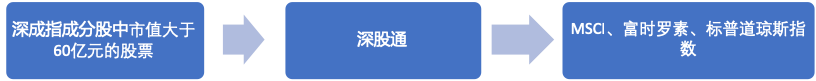 深股通则从深证成指、深证中小创新指数中选取市值不低于60亿元的成分股。与沪股通一样,被实施风险警示的深股也会被剔除。