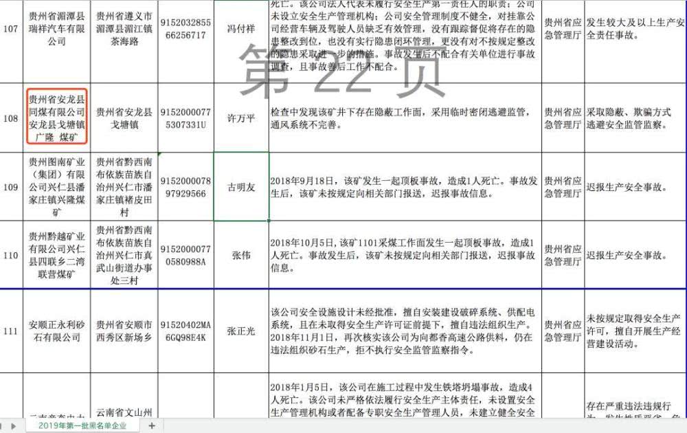 根据应急管理部今年3月发布的《2019年第一批安全生产失信联合惩戒“黑名单”单位及人员名单》,广隆煤矿曾因“采取隐蔽、欺骗方式,逃避安全监管监察”而被贵州省应急管理厅列入安全生产领域失信生产经营单位,根据通报简况,检查中发现该矿井下存在隐蔽工作面,采用临时密闭逃避监管,通风系统不完善。