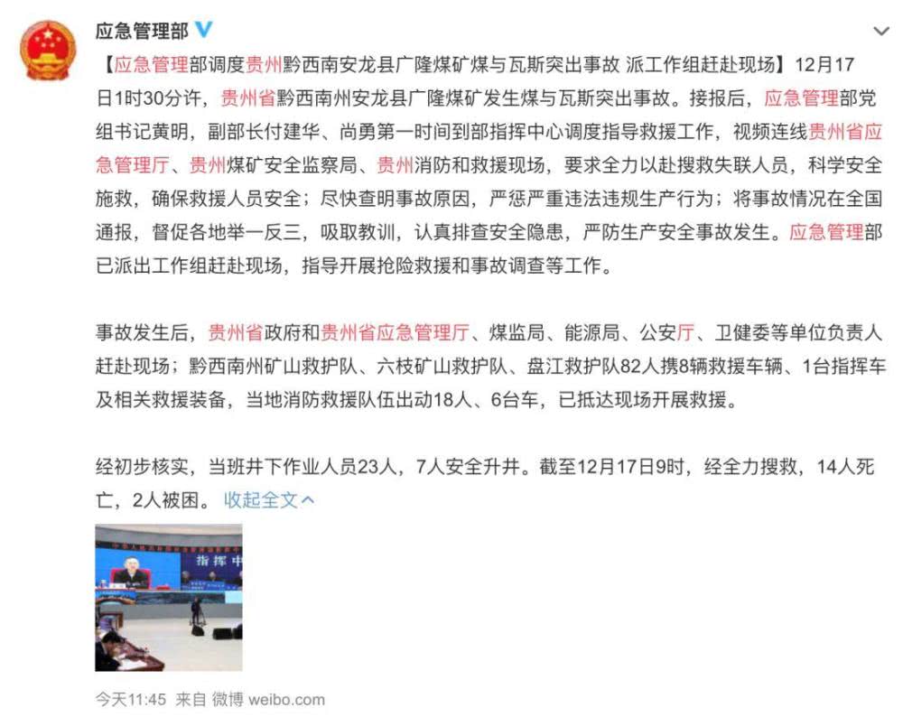 据应急管理部消息,2019年12月17日早上1时30分,贵州省黔西南州安龙县广隆煤矿发生一起煤与瓦斯突出事故。事发后应急管理部紧急派出工作组赶赴事发现场,经初步核实,当班井下作业人员23人,7人安全升井。截至9时,经全力搜救,14人死亡,2人被困。