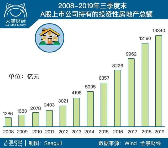 一晃儿到了现在,截止2019年三季报,A股3743家上市公司中,有1826家上市公司持有投资性房地产,占比超过48%,上市公司们合计持有房产市值达13340亿元。